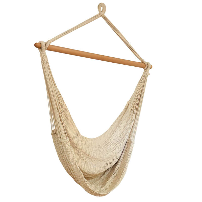 Besonders hervorzuheben: Extra dicke 3 mm Baumwollschnüre für Stabilität und Komfort; elastisches Netz bis 260 cm dehnbar für eine bequeme, aufrechte Sitzposition; 110 cm Spreizstab aus FSC-zertifizierter, geölter Buche; sichere Einkerbungen gegen Verrutschen; platzsparend aufrollbar; handgeknüpft in fairem Familienbetrieb.