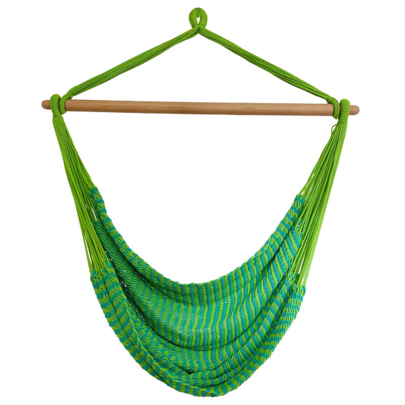 Besonders hervorzuheben: Extra dicke 3 mm Baumwollschnüre für Stabilität und Komfort; elastisches Netz bis 260 cm dehnbar für eine bequeme, aufrechte Sitzposition; 110 cm Spreizstab aus FSC-zertifizierter, geölter Buche; sichere Einkerbungen gegen Verrutschen; platzsparend aufrollbar; handgeknüpft in fairem Familienbetrieb.