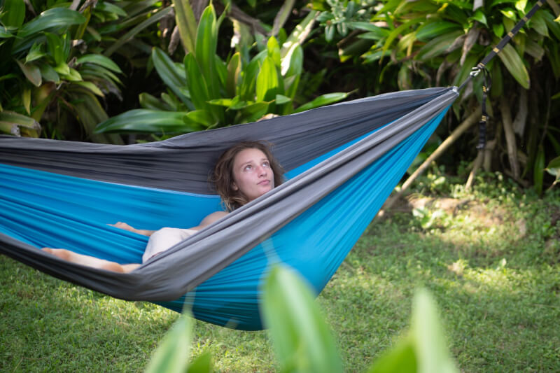 Besonders hervorzuheben: Kompakt und trotzdem unglaublich komfortabel; feinste Fallschirmseide; OEKO-TEX®-zertifizierte, handgemachte Qualität; intuitiver Aufbau ohne Knoten; praktische Seitentasche; inkl. Moonbag und S-Haken; faire Produktion.